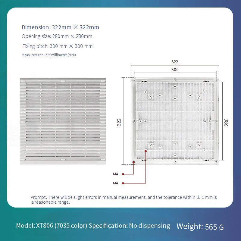 Installation kräver endast rengöring av monteringsytan, justerar dammskyddet och trycker på det på plats. Det rekommenderas att kvartalsvisa inspektioner för dammansamling genomförs med hjälp av en dammsugare eller tryckluft för rengöring. Byt ut omedelbart när ventilationseffektiviteten märkbart minskar eller skador uppstår för att upprätthålla skyddseffektiviteten.