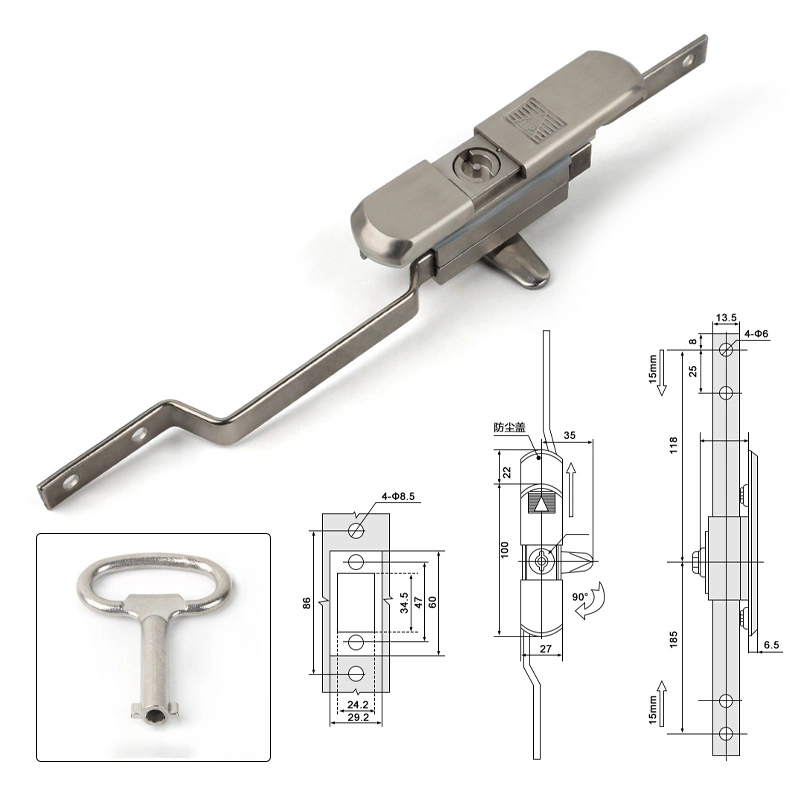 Funktionen för detta lås är att säkra skåpdörrar via en vertikal stångmekanism, vilket ger omfattande skydd för elektriska skåp eller serverställen. Produktdesignen är kompatibel med rittalskåp och standardskåp, och installationen påverkar inte dörrstrukturen. Låskroppen har ett dammskydd för förenklat underhåll.