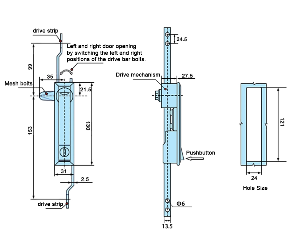 Dörrlåset i rostfritt stål är tillverkat av rostfritt stål i den ursprungliga rostfritt stålfärgen för hållbarhet och korrosionsbeständighet. Öppningsstorleken är 24 mm × 121 mm, vilket säkerställer kompatibilitet med standardinstallationskonfigurationer.
