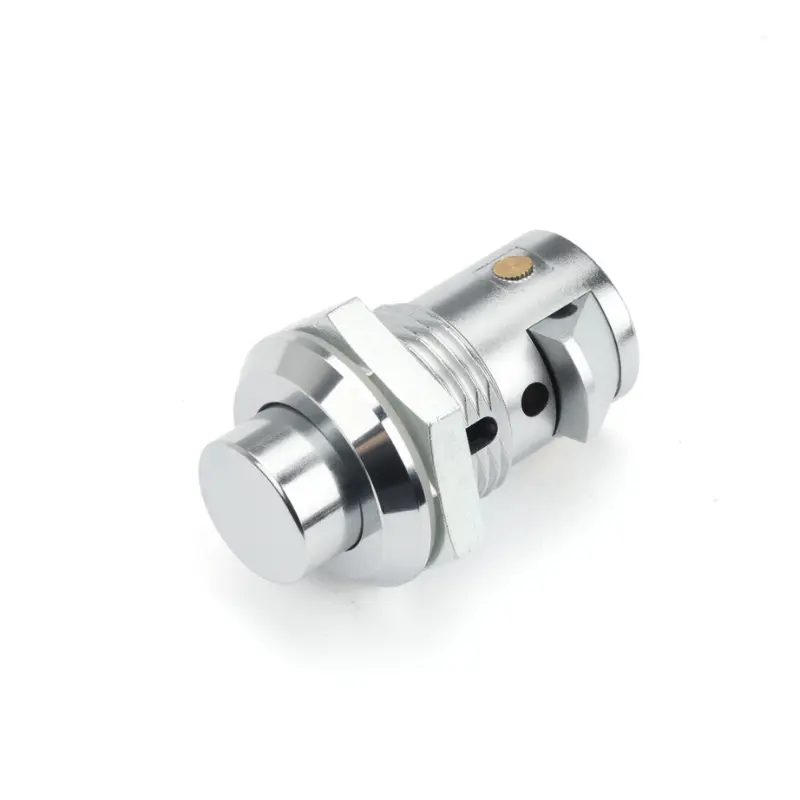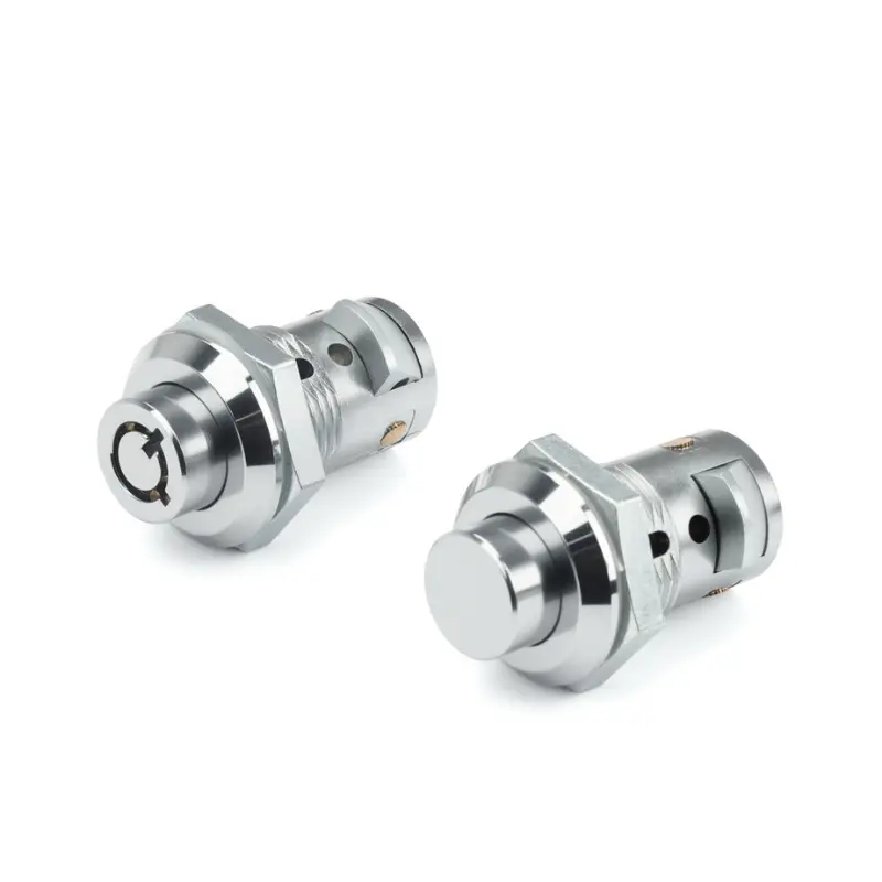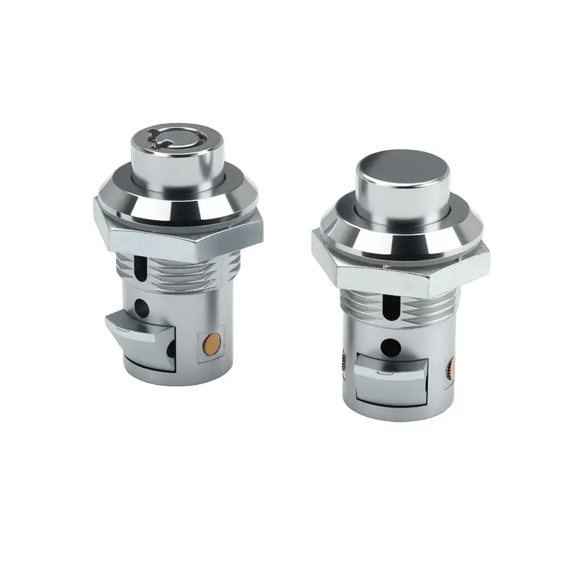 Tryckknappsmodellen låses automatiskt upp när knappen trycks in och låses när dörren är stängd, vilket ger grundläggande säkerhetsskydd. Stifttillhållarlåsmodellen använder en stiftmekanism som endast tillåter rotation med en matchande nyckel, vilket ger stöldskyddsfunktionalitet. Båda modellerna använder en zinklegeringskonstruktion för att erbjuda en viss nivå av styrka, och har extra vattentäta packningar för extra funktionalitet. Varuautomaternas cylinderlås i zinklegering har en blank kromfinish för korrosionsbeständighet. Den maximala tjockleken på installerade dörrpaneler är 10 mm.(För material i rostfritt stål, kontakta oss. Vi tillverkar för närvarande formarna.)