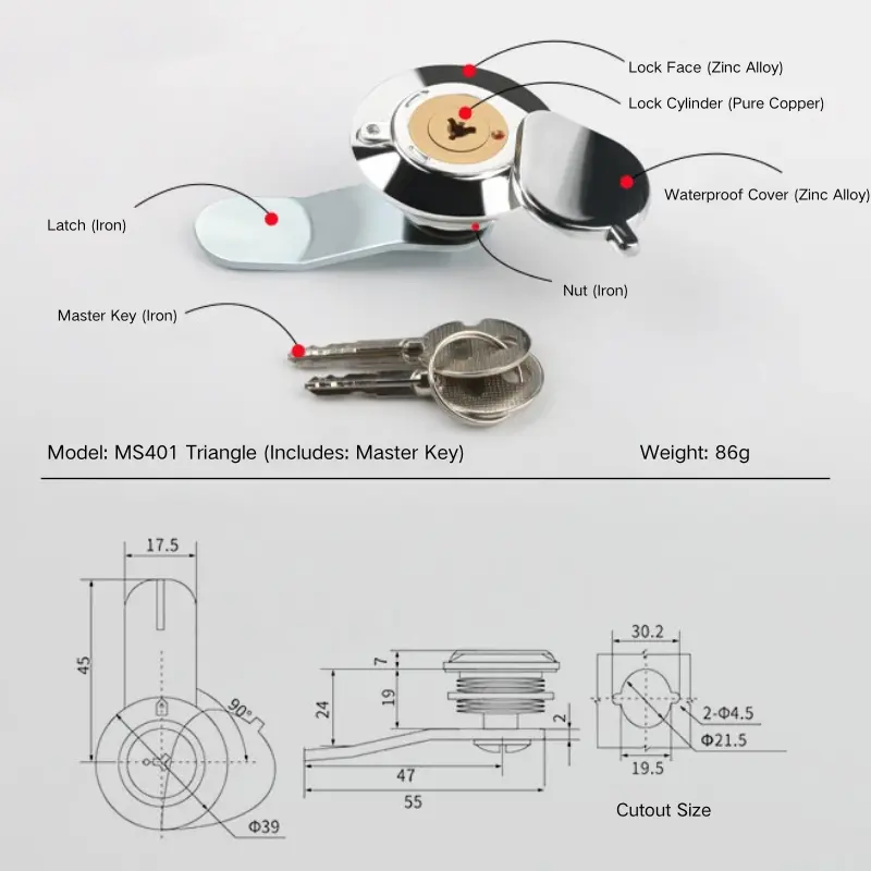 Det vattentäta locket och låsytan på det vattentäta utomhuslåset är tillverkade av zinklegering, vilket ger god strukturell styrka. Låscylindern är gjord av ren koppar för att göra den mer hållbar. Spärren, muttrarna och huvudnyckeln är gjorda av järn.